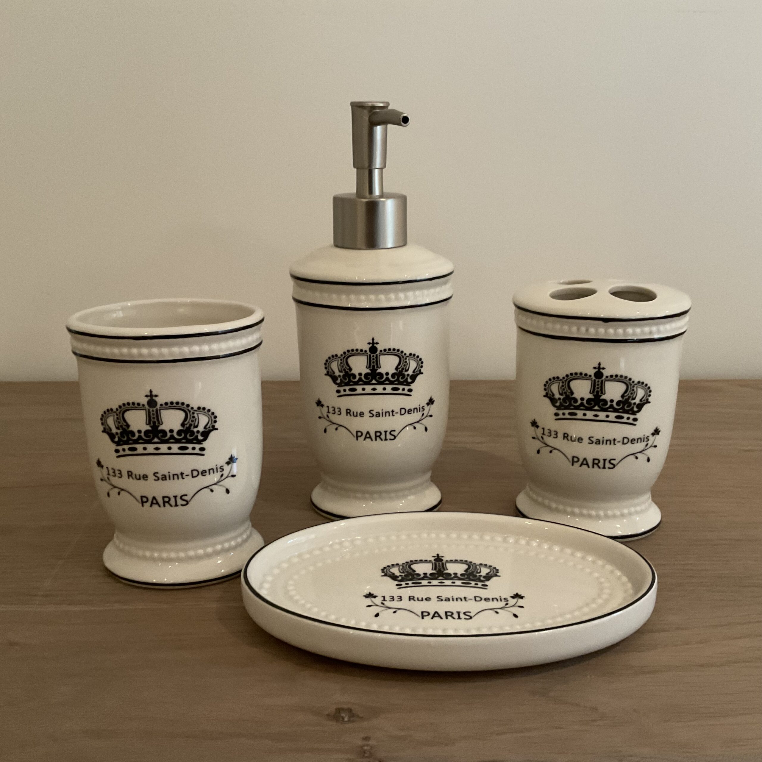 Badkamerset bestaande uit: – Zeeppompje – Zeepschaaltje – tandenborstelhouder – drinkbeker