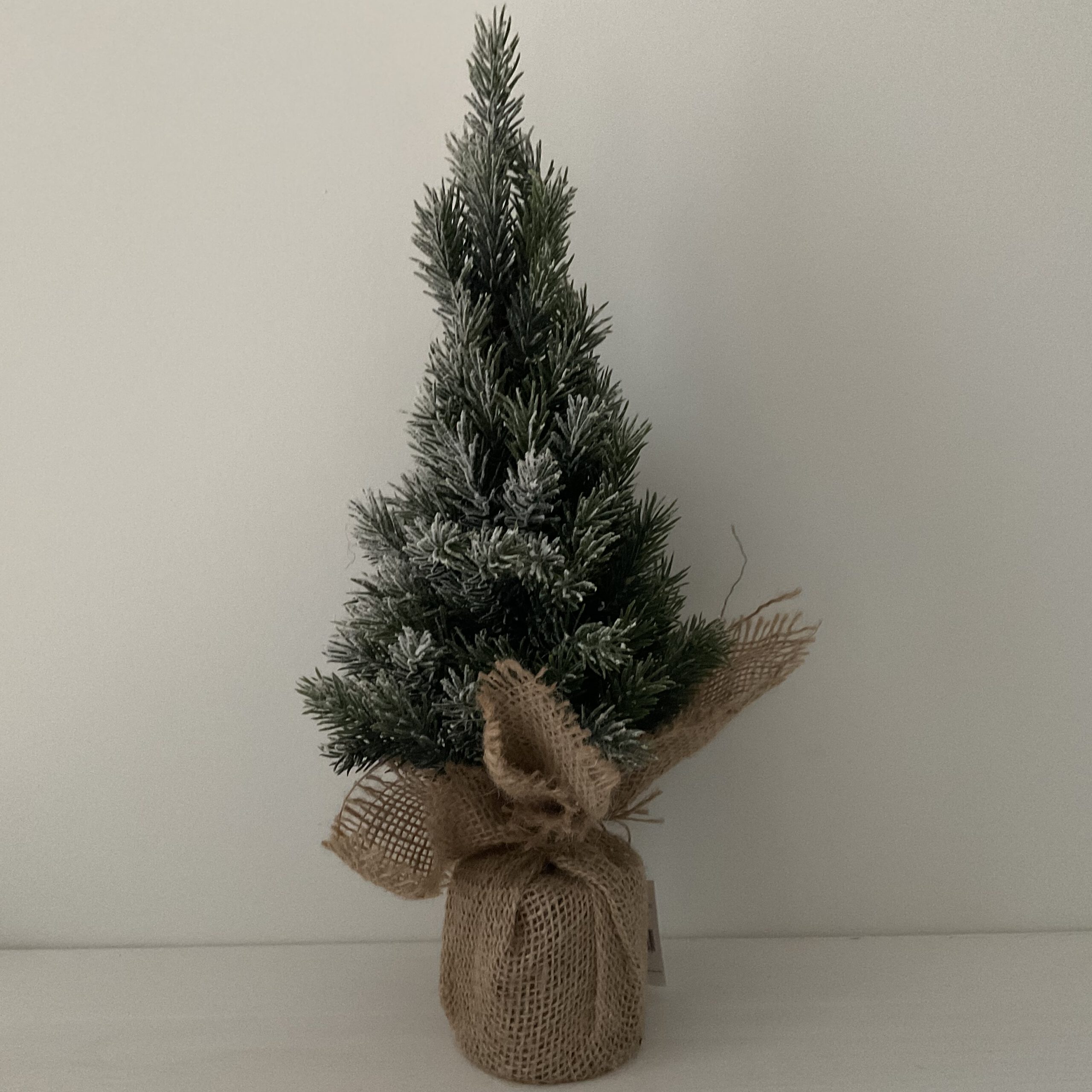 besneeuwde kerstboom in jute zak