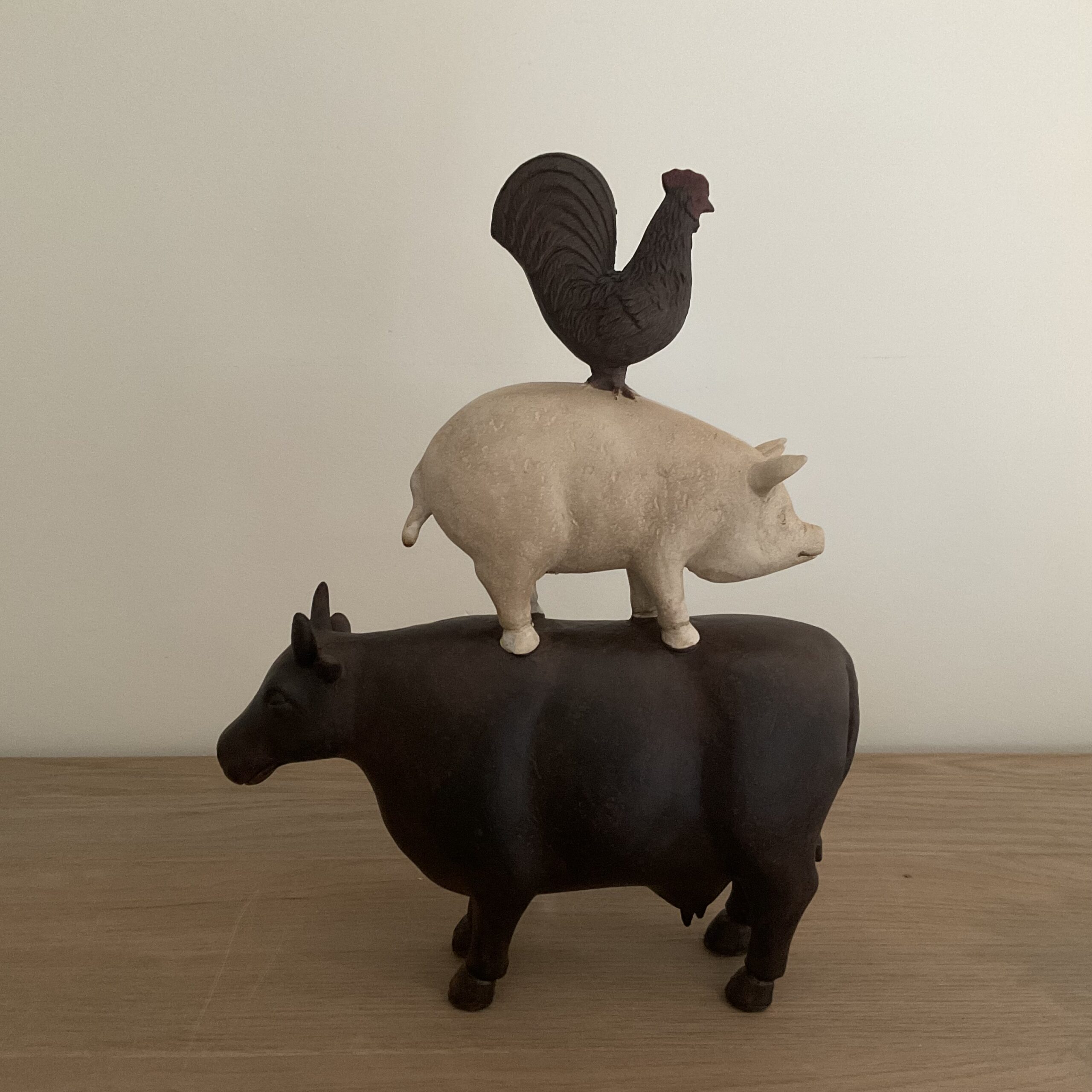 Koe/varken en haan op elkaar