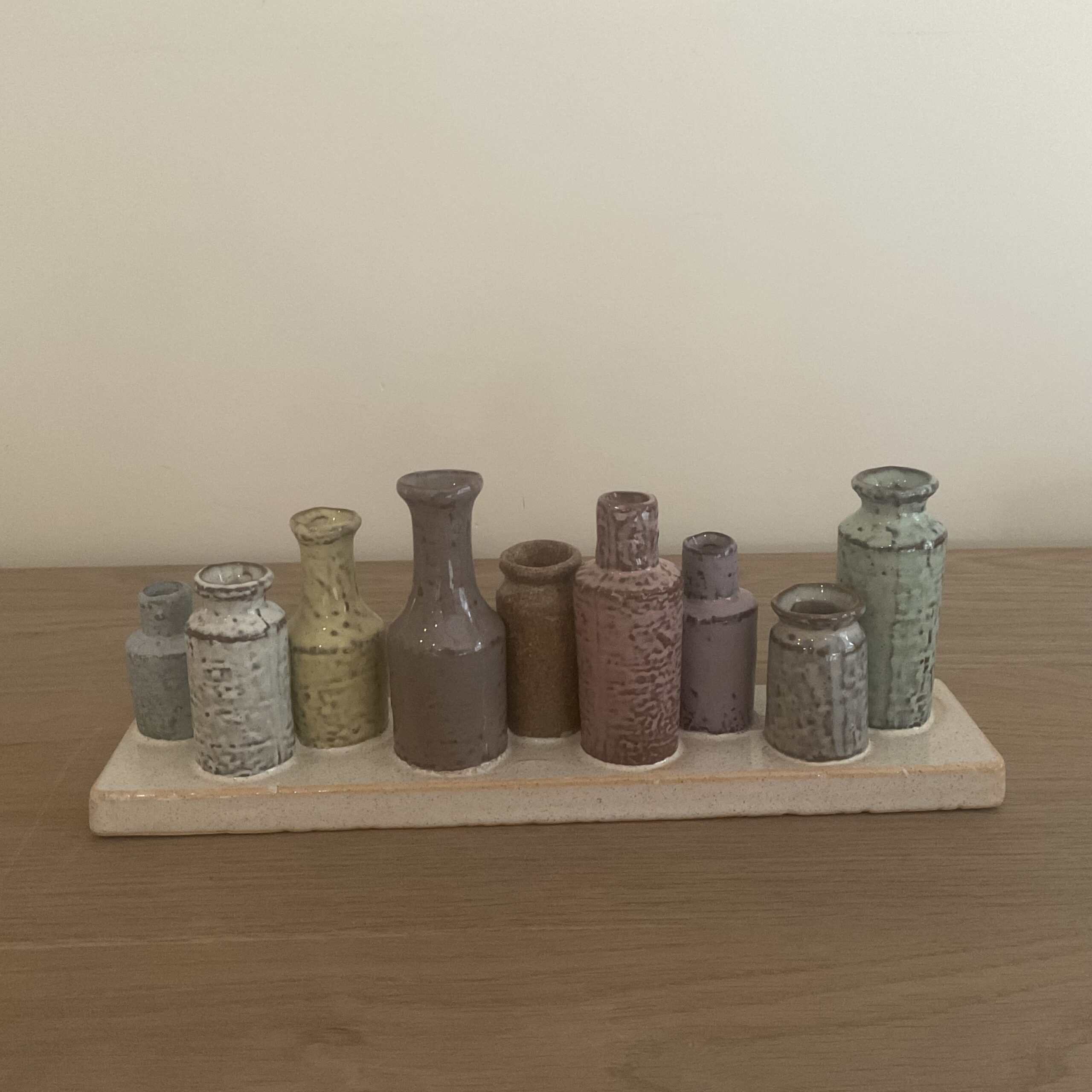 Plankje met verschillende kleine vaasjes